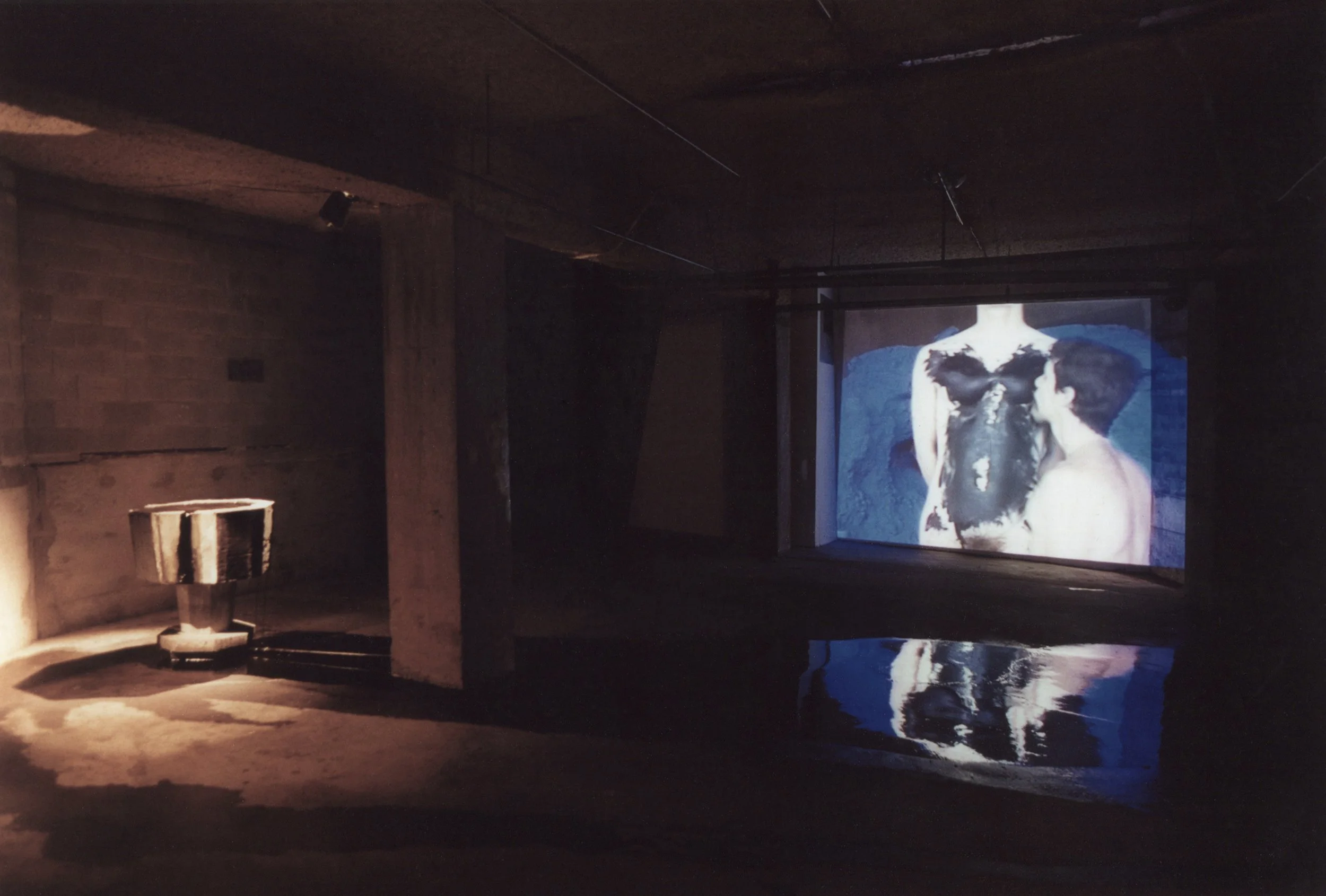 Consider Koiman, 1998, an ambitious mixed media site-specific video-sound-object work that was exhibited at Space 1181 in Atlanta, Georgia in 1998. Using a wall-sized video-projection, an 800-pound cast-concrete baptismal font, 60 gallons of used motor oil, a mound of blue-painted earth and prerecorded ambient train sounds, Weiss constructed a moving and interrogatory installation. The oil continuously overflowed the rim of the vessel, and the river of oil issued forth across the slanted gallery floor and led towards the wall where a video projection showed two androgynous figures. One was kneeling and suckling at the breast of the other, as though licking tarry, coagulated life's blood dribbling from the nipple of a breast.