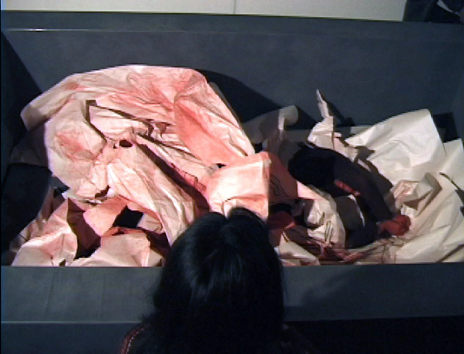 Meena Alexander observing Monika Weiss’ performance in 2005 Lehman College Art Gallery, Bronx, New York. The artist is lying inside her sculpture, Lethe Room, 2004-2005 and drawing around her body with chunks of charcoal and dry pigment, as part of the survey exhibition Monika Weiss: Five Rivers, 2005-2006.